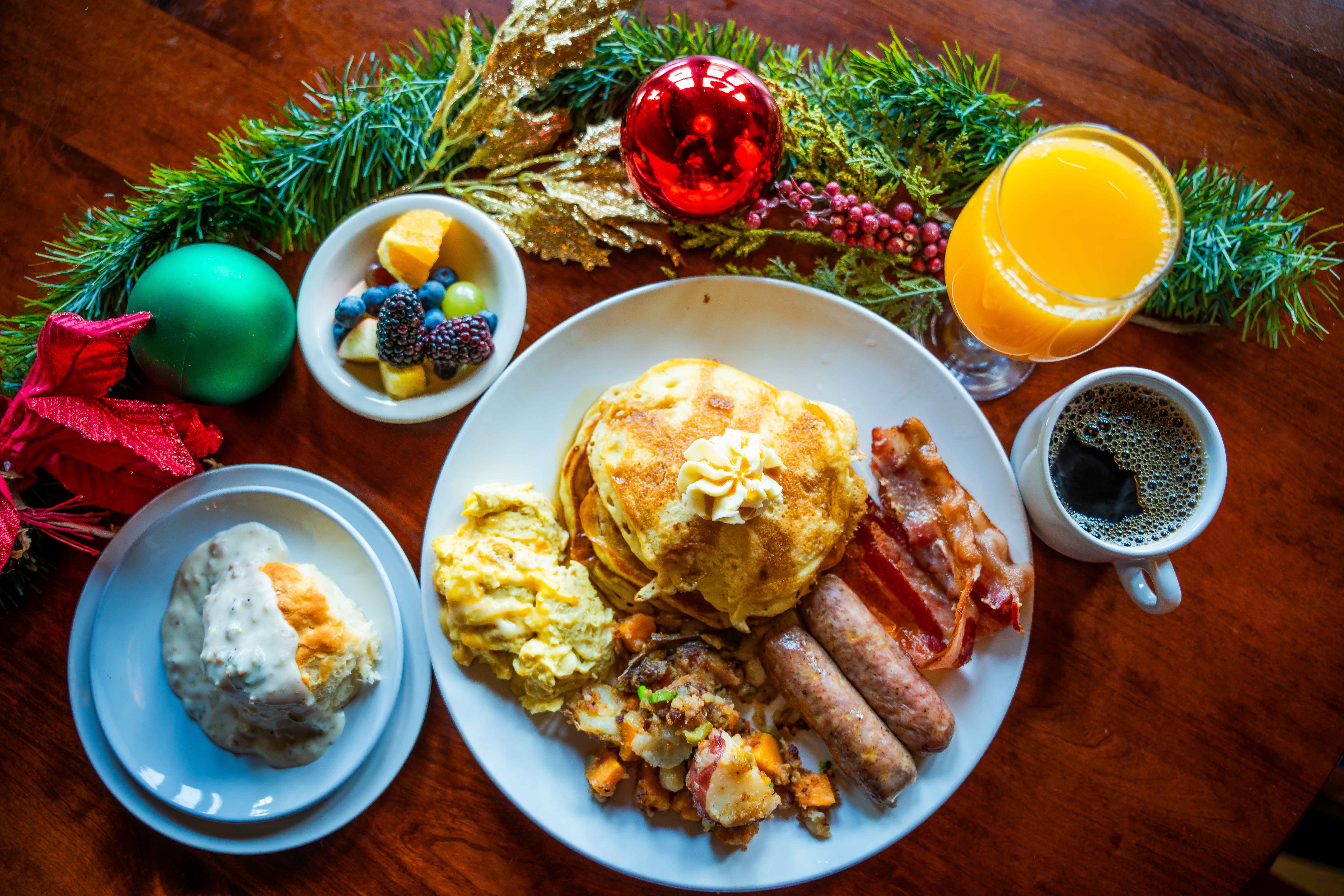 Menu: Scrambled Eggs, Sausage, Bacon, Home Fries, Pancakes, Biscuits & Gravy, Fruit, Coffee, Tea, Juice, and Milk.
